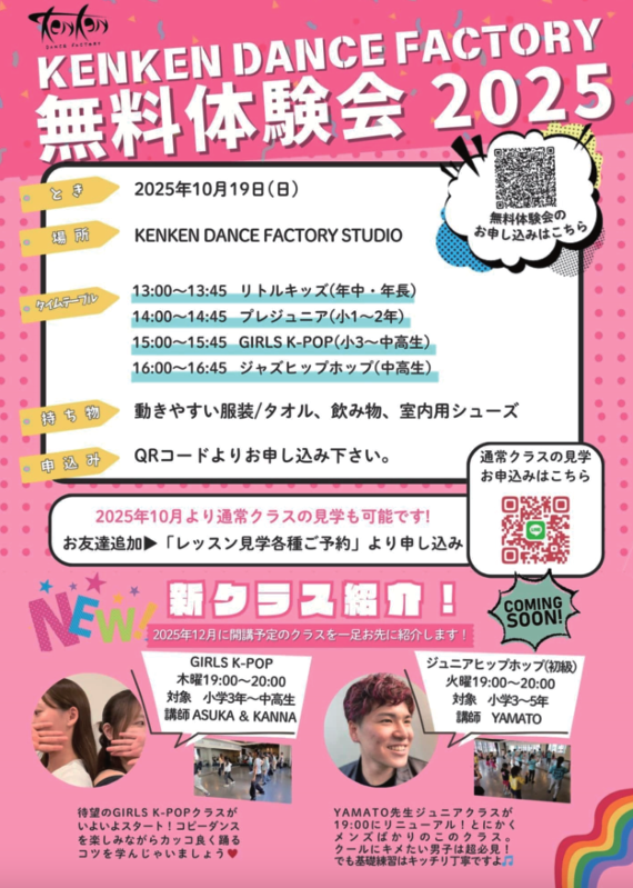 はい、大丈夫です。まずは楽しんで踊ることが一番大事!小学生向けのジュニアクラスも、中学生以上一般向けの基礎入門クラスも、専門のインストラクターが基礎から丁寧にお教えしますのでご安心ください。